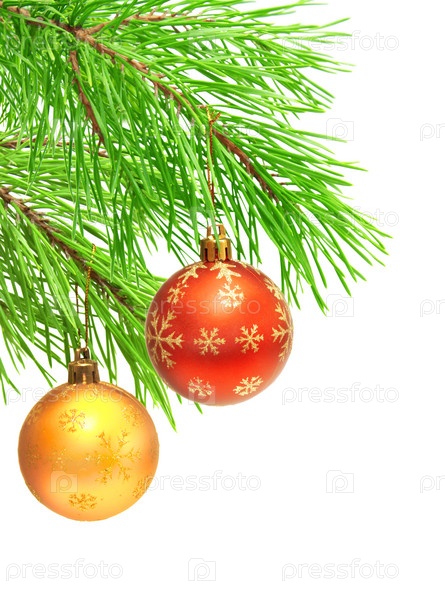 Новогодние шарики на ветке сосны