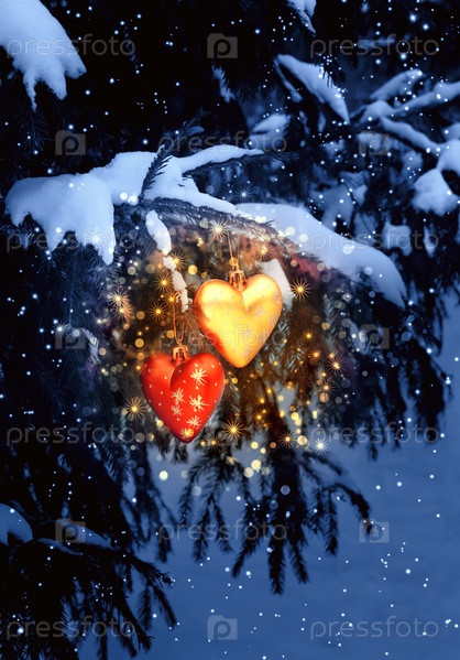 Новогодние украшения на заснеженной елке