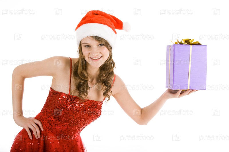 Изображение улыбающейся женщины с фиолетовой коробкой в руке