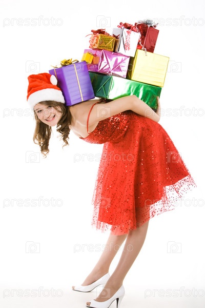 Изображение молодой женщины в красном платье, несущей коробки на спине