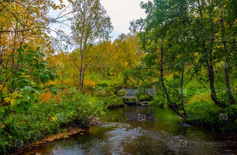 Старый мост через речку в осеннем лесу