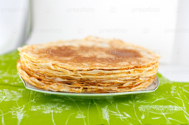Стопка блинов на тарелке на зеленой скатерти