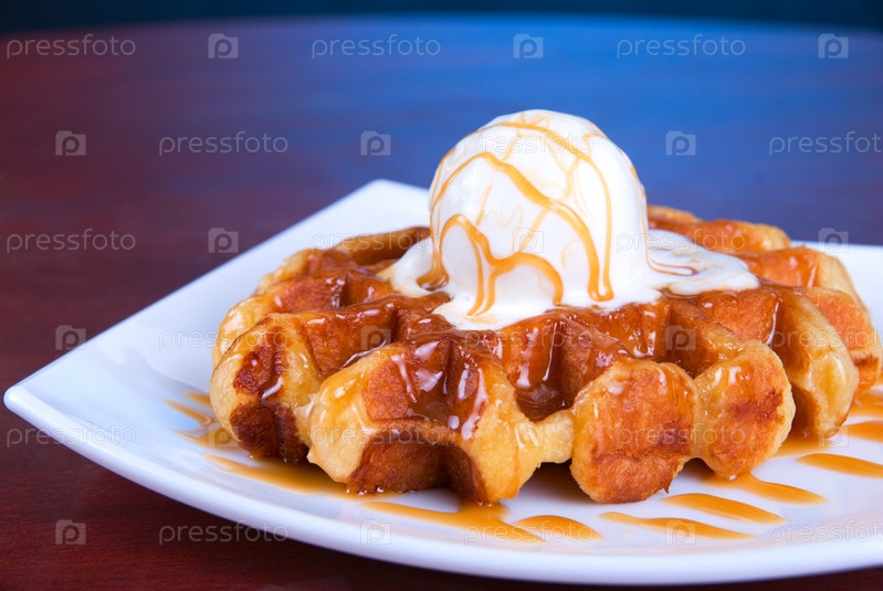 Вафля с мороженым на тарелке
