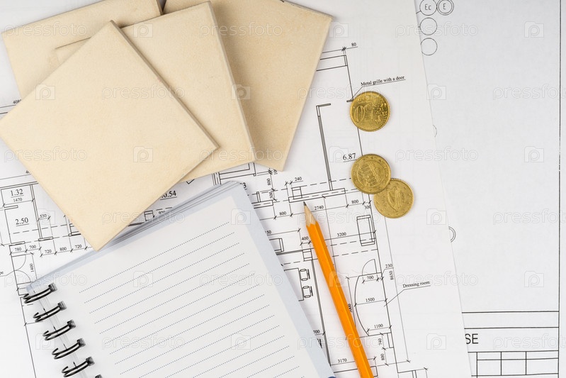 Чертежи, блокнот с карандашом и мелочь