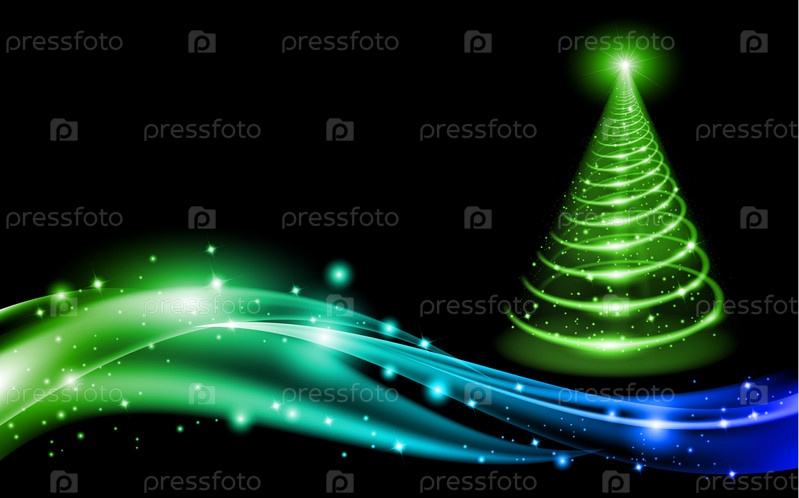 Зеленая новогодняя елка изображена в виде спирали на черном фоне с волной