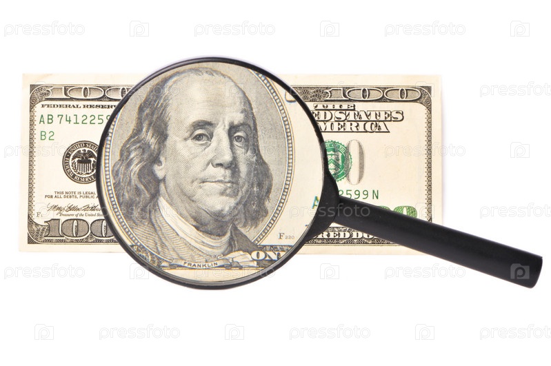 Лупа увеличивает изображение президента Бенджамина Франклина на 100 долларовой купюре