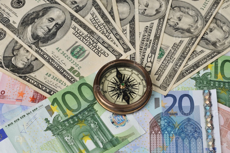 Компас лежит на валютах США и Европы