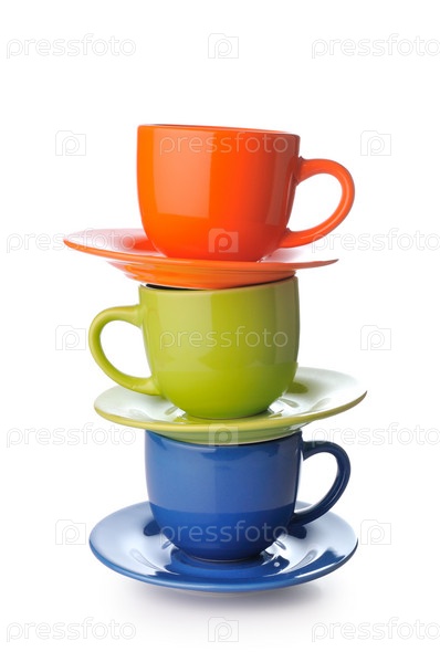 Три цветные чашки с блюдцами стоят башней, изолированный на белом фоне