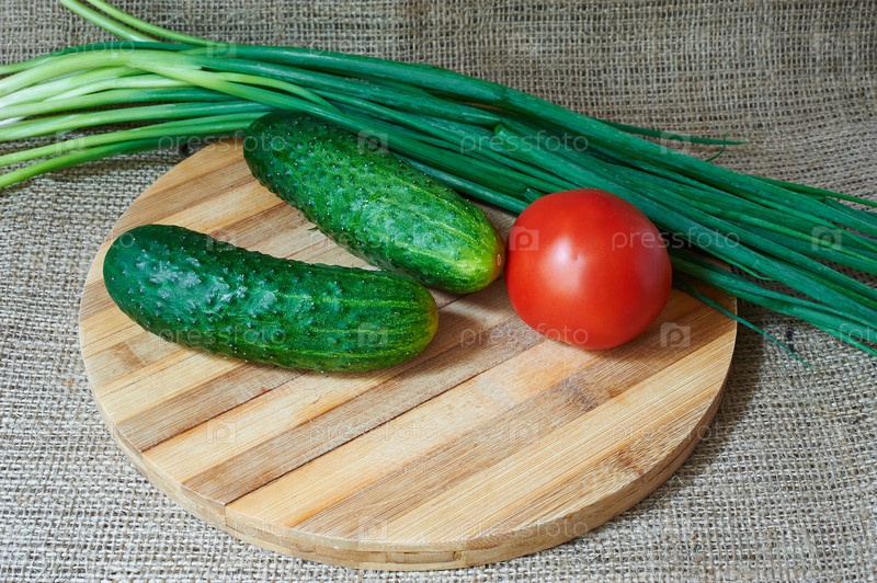 Свежие красные помидоры, огурцы и зеленый лук