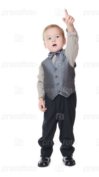 Маленький мальчик в костюме бизнес показывает палец