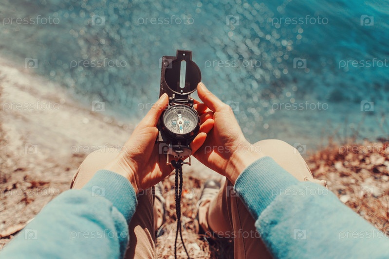 Путешественник, держа Компас на побережье