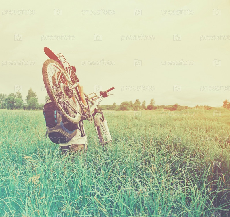 Велосипедист мужчина несет велосипедов на лугу