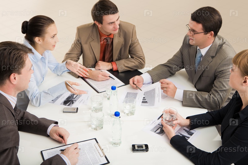 Портрет деловых людей, сидящих за столом и взаимодействующих