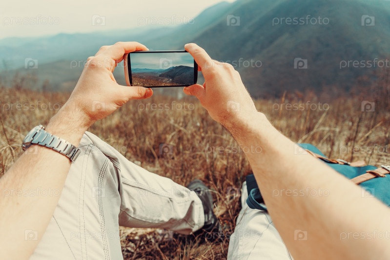 Человек принимает фотографии горы с смартфон