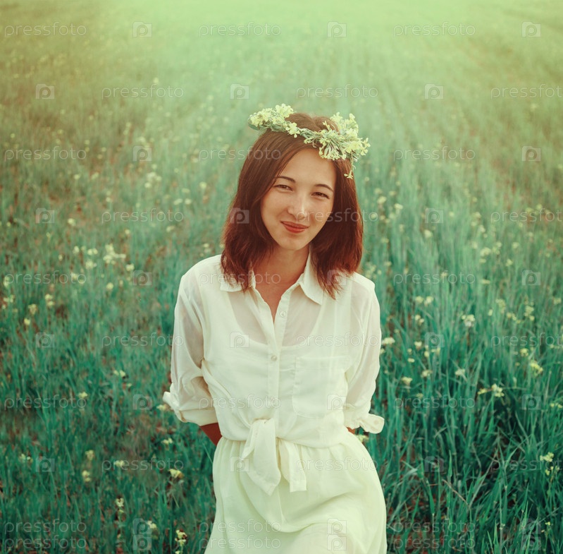 Красивая молодая женщина с венком из цветов в летнее время