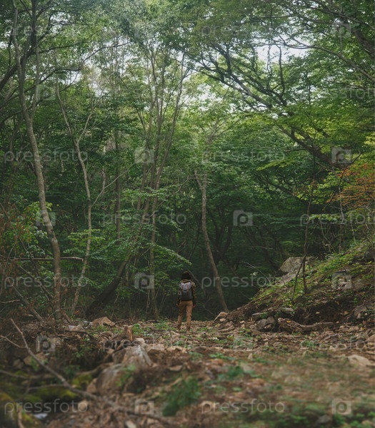 Путешественник женщину ходить в летний лес