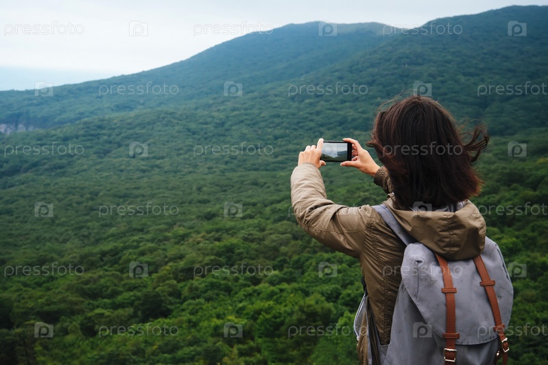 Турист женщина, принимая фотографии пейзаж горы