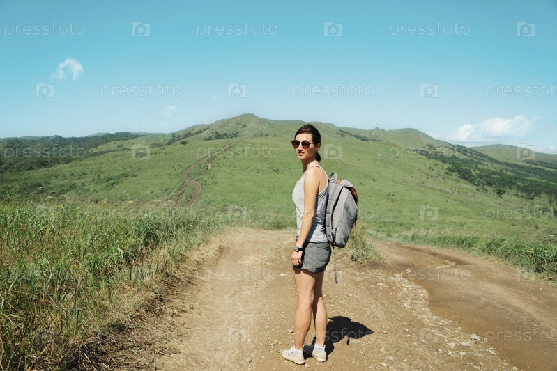 Девочка путешественник, прогуливаясь среди гор