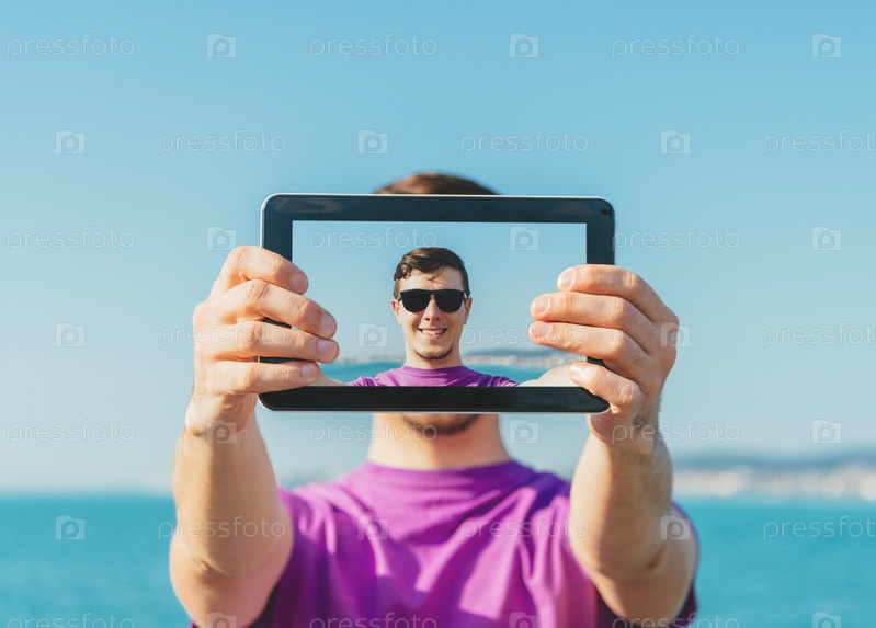 Человек делает Автопортрет с ним цифровой планшет на пляже