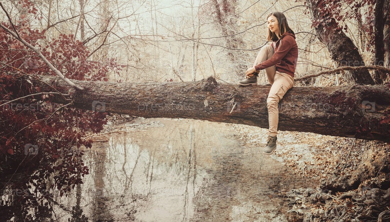 Девочка сидит на стволе дерева в осеннем лесу