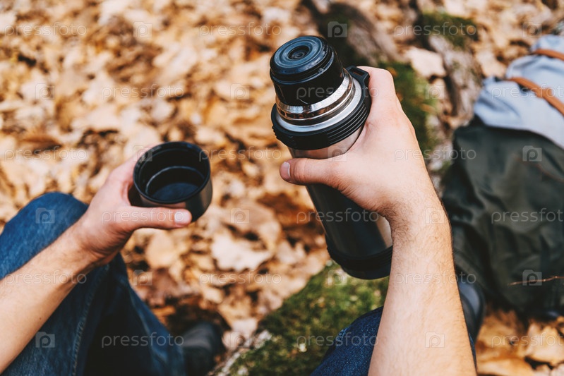 Путешественник человек, держащий термос в осеннем лесу