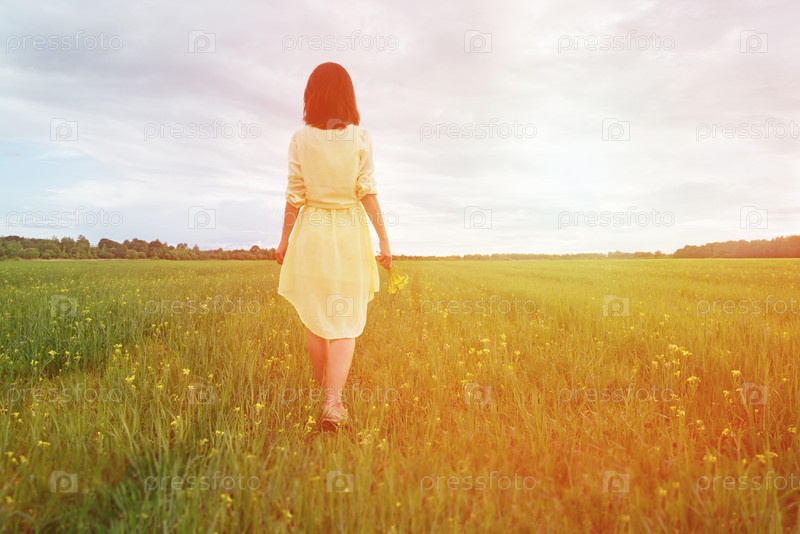 Женщина, ходить на летнем лугу