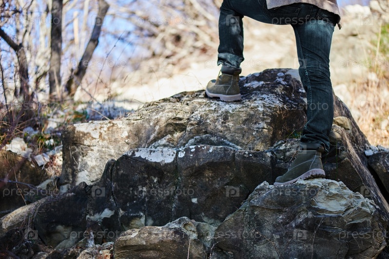 Турист женщина идти на скале, вид ног