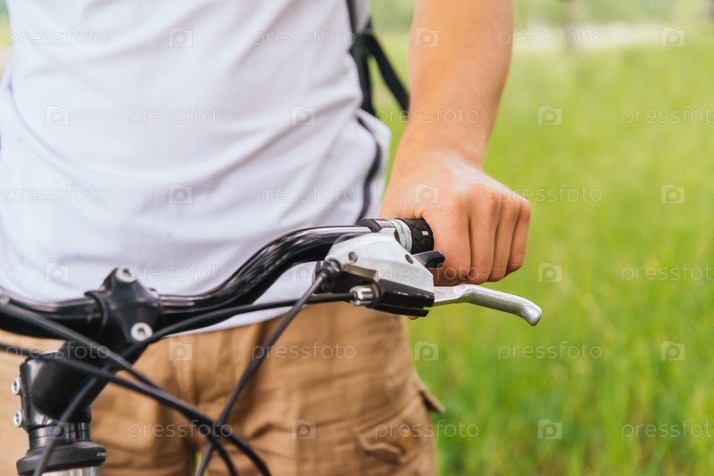 Мужской рукой, держащей ручку горного велосипеда