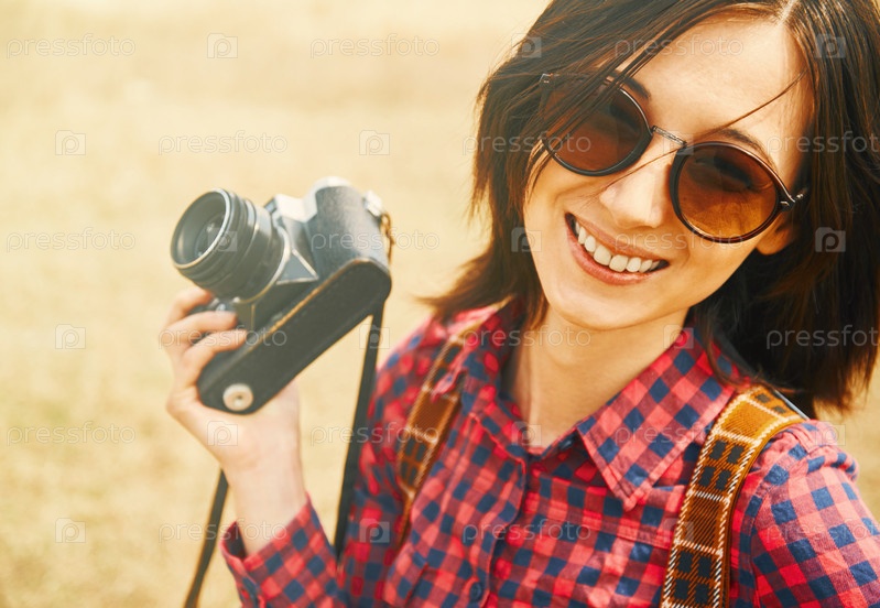 Жизнерадостная девочка с Старый фотоаппарат весной