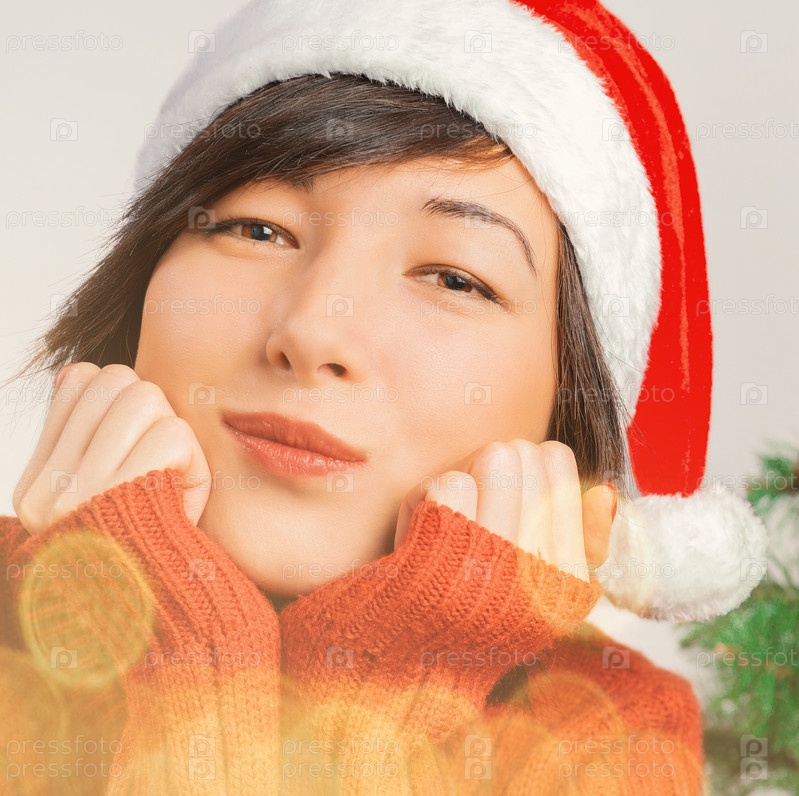 Улыбаясь молодая женщина в шляпе Санта