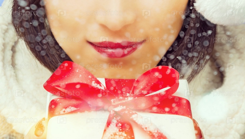 Улыбающиеся женщина с подарочной коробке под снегом, макро
