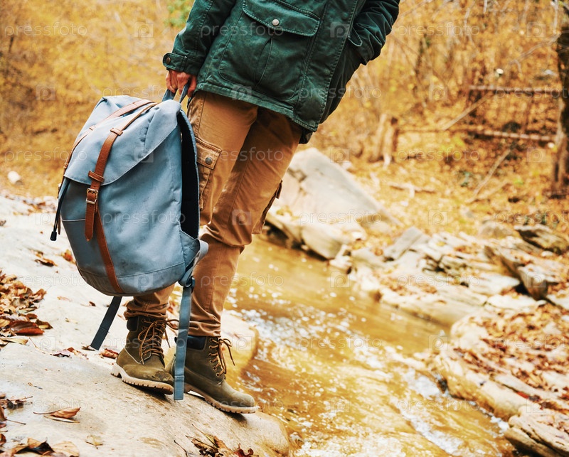 Туристы с рюкзак стоя возле ручья