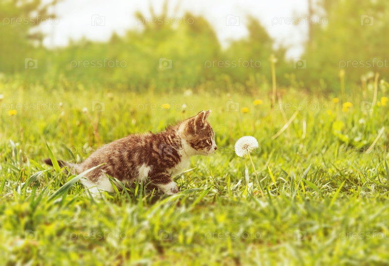 Любопытство котенка, нюхают одуванчика