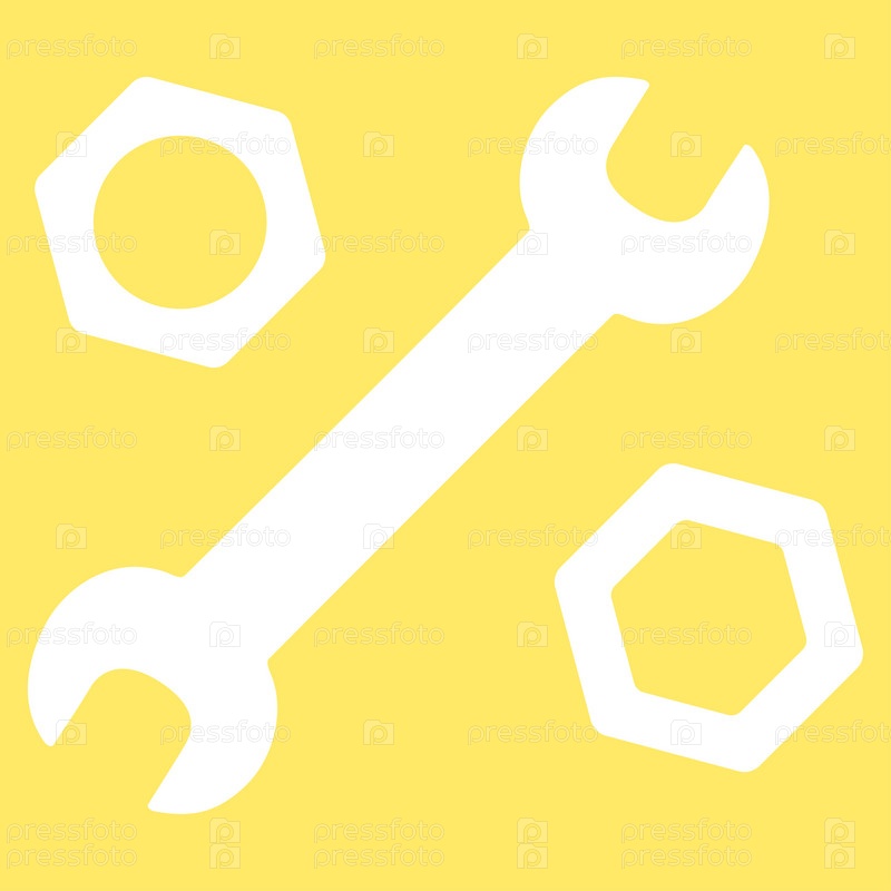 Иллюстрация значок гаечного ключа и орехи. Стиль является плоской символ, белый цвет, закругленные углы, желтый фон