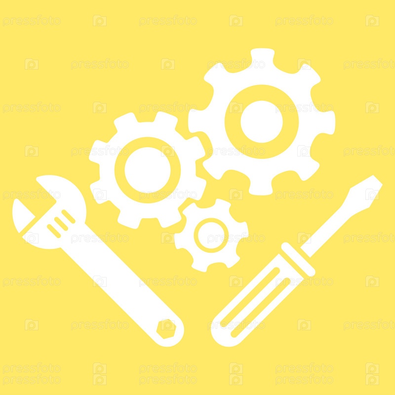 Механика инструменты иллюстрации значок. Стиль является плоской символ, белый цвет, закругленные углы, желтый фон
