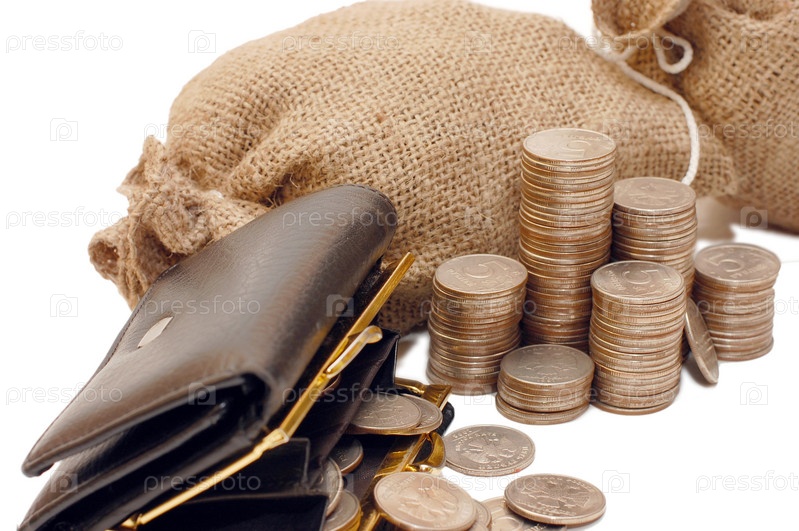 Портмоне и мешки с монетами на белом