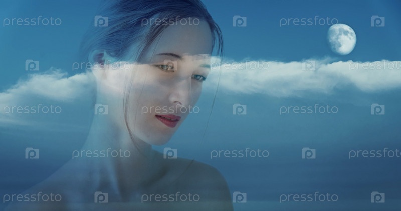 Двойная экспозиция, портрет красивой девушки с ночным небом