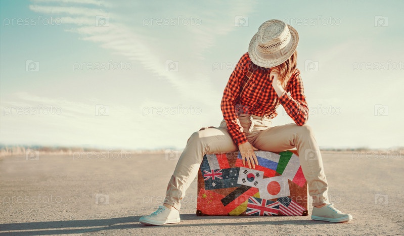 Турист, сидя на чемодане