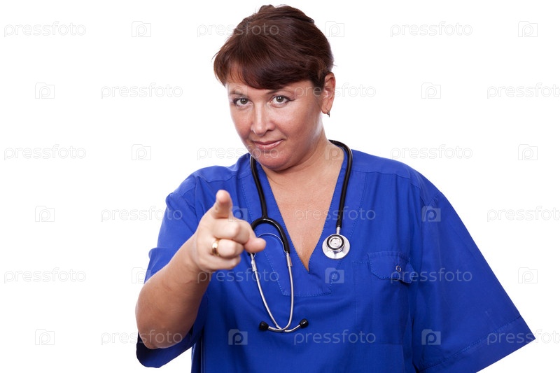 Женщина-врач показывает пальцем вперед, на белом фоне