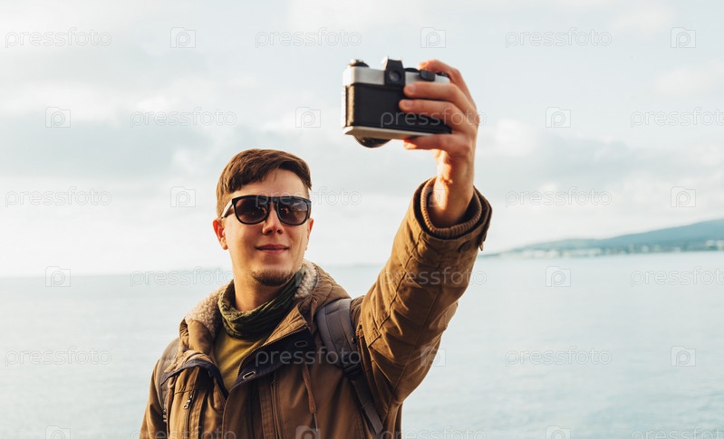 Улыбающийся человек селфи на море