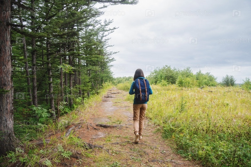 Девушка прогуливается по тропинке в лесу