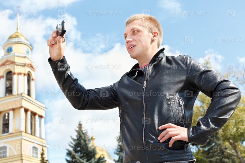 Парень фотографирует на любительскую камеру на улице города