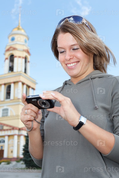 Девушка просматривает отснятые кадры на камере