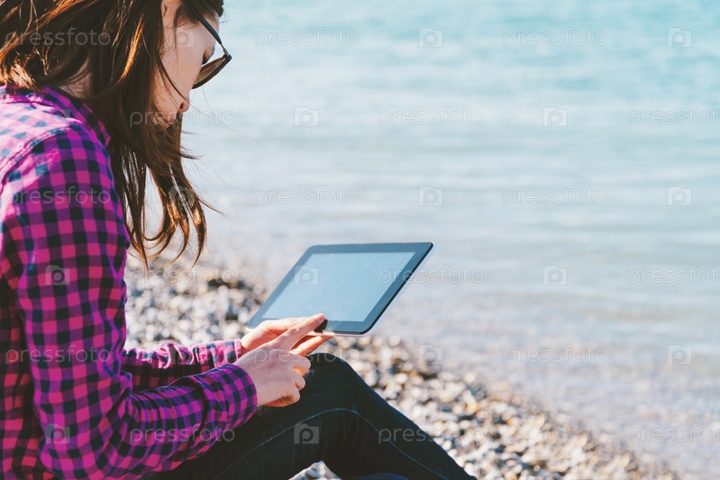 Женщина с планшетом на пляже