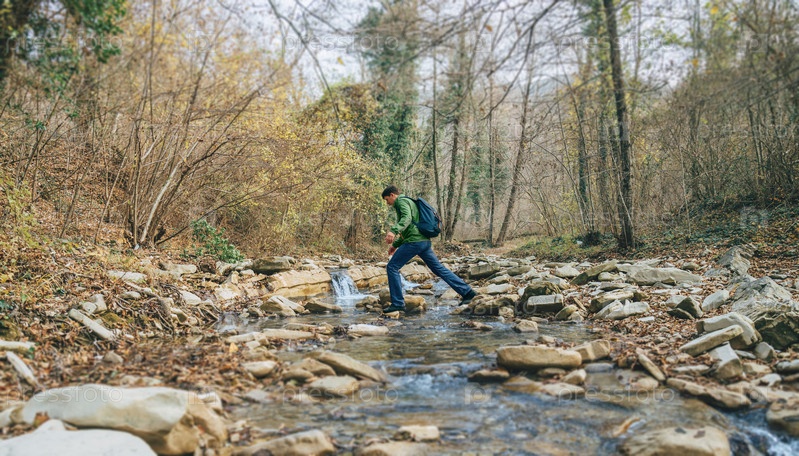 Турист пересекает ручей