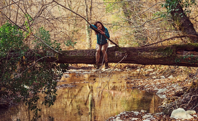 Женщина на стволе дерева над рекой