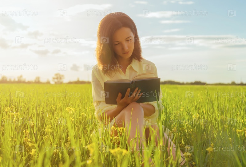 Женщина, читая книгу на летнем лугу