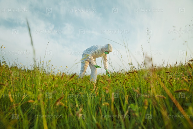 Ученый в химзащите на поле