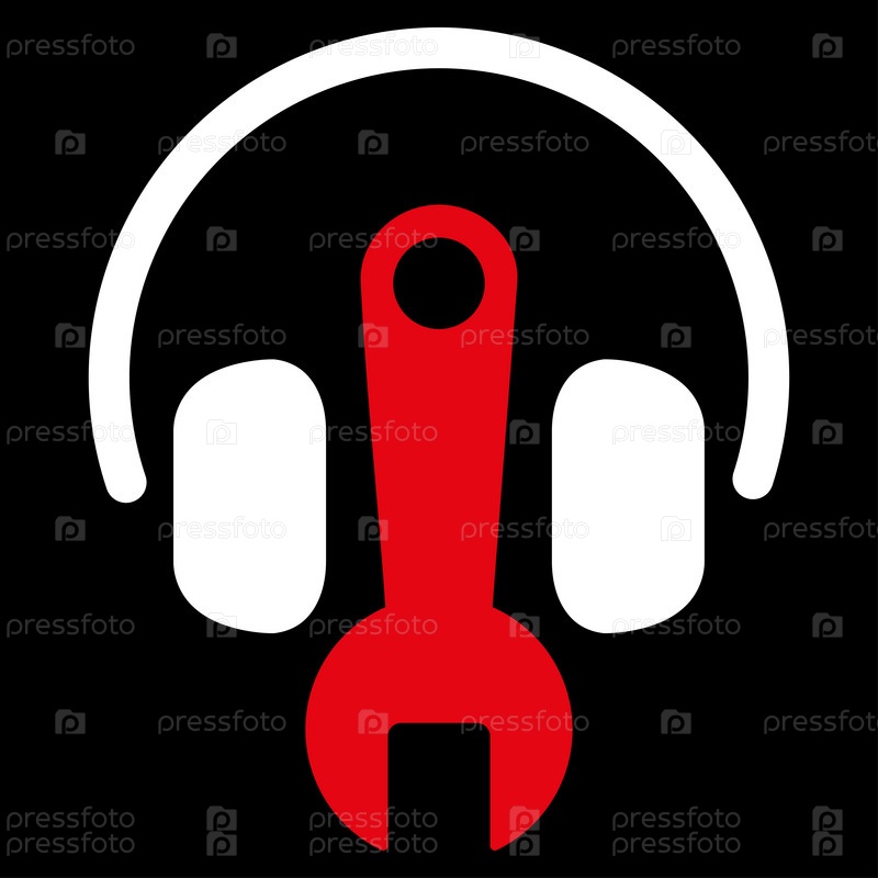 Наушники значок растровых инструментов. Стиль является биколор плоский символ, красный и белый цвета, закругленные углы, черный фон