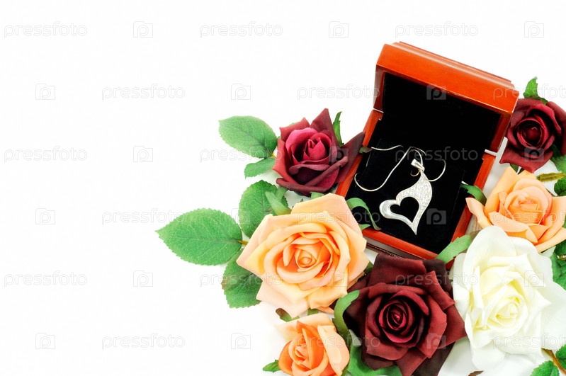 Подвеска в виде сердечка и красные розы на белом фоне